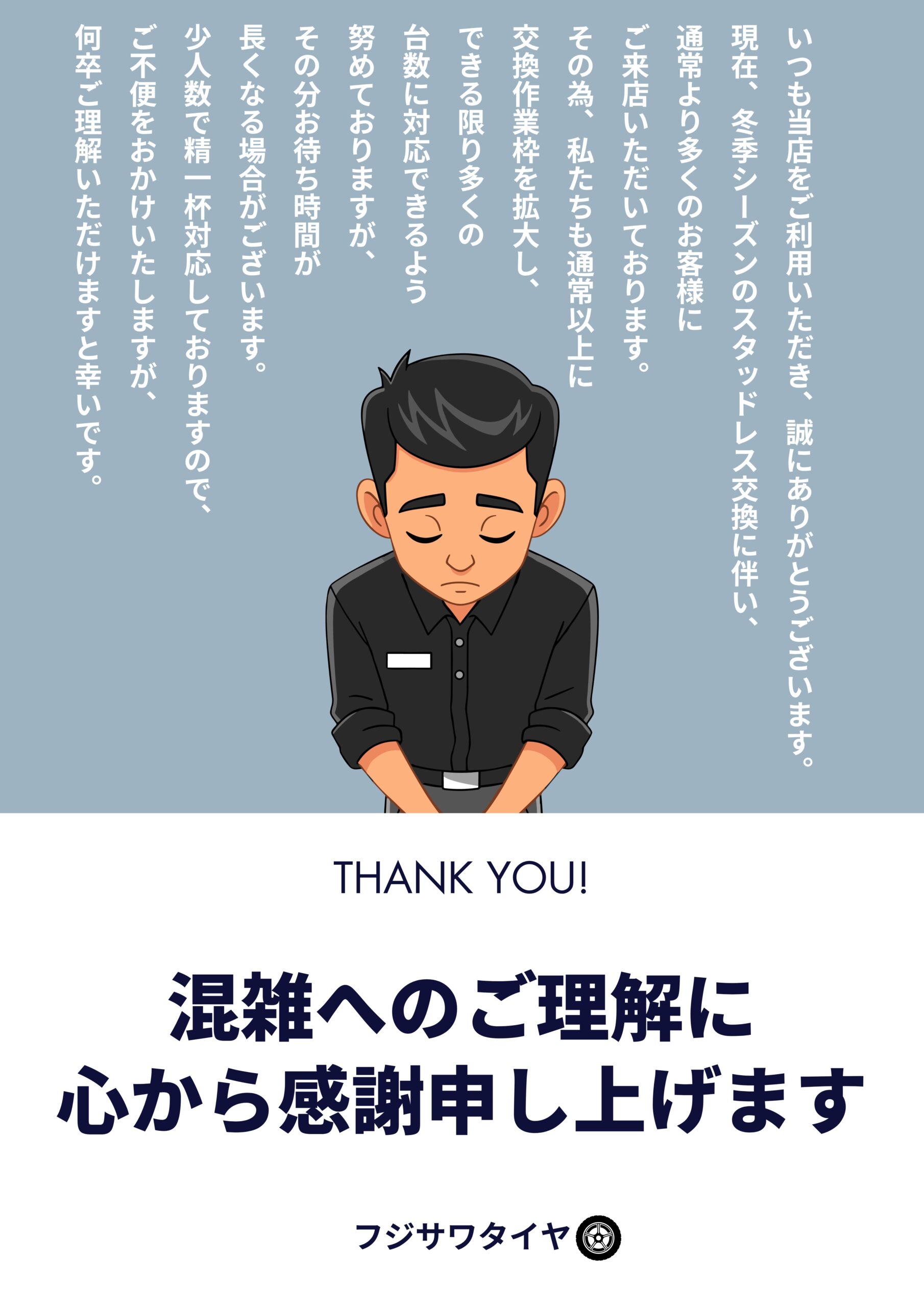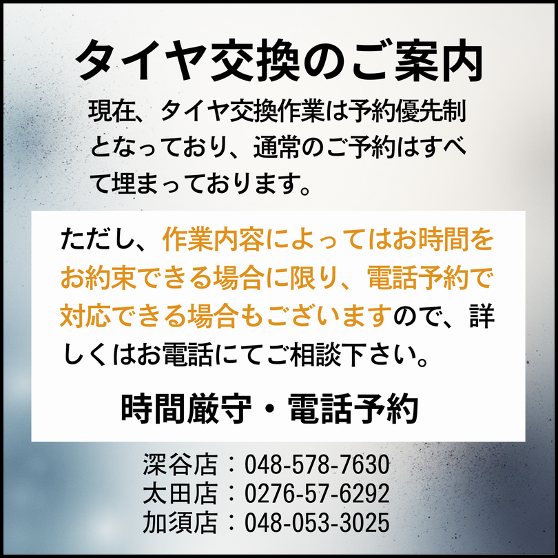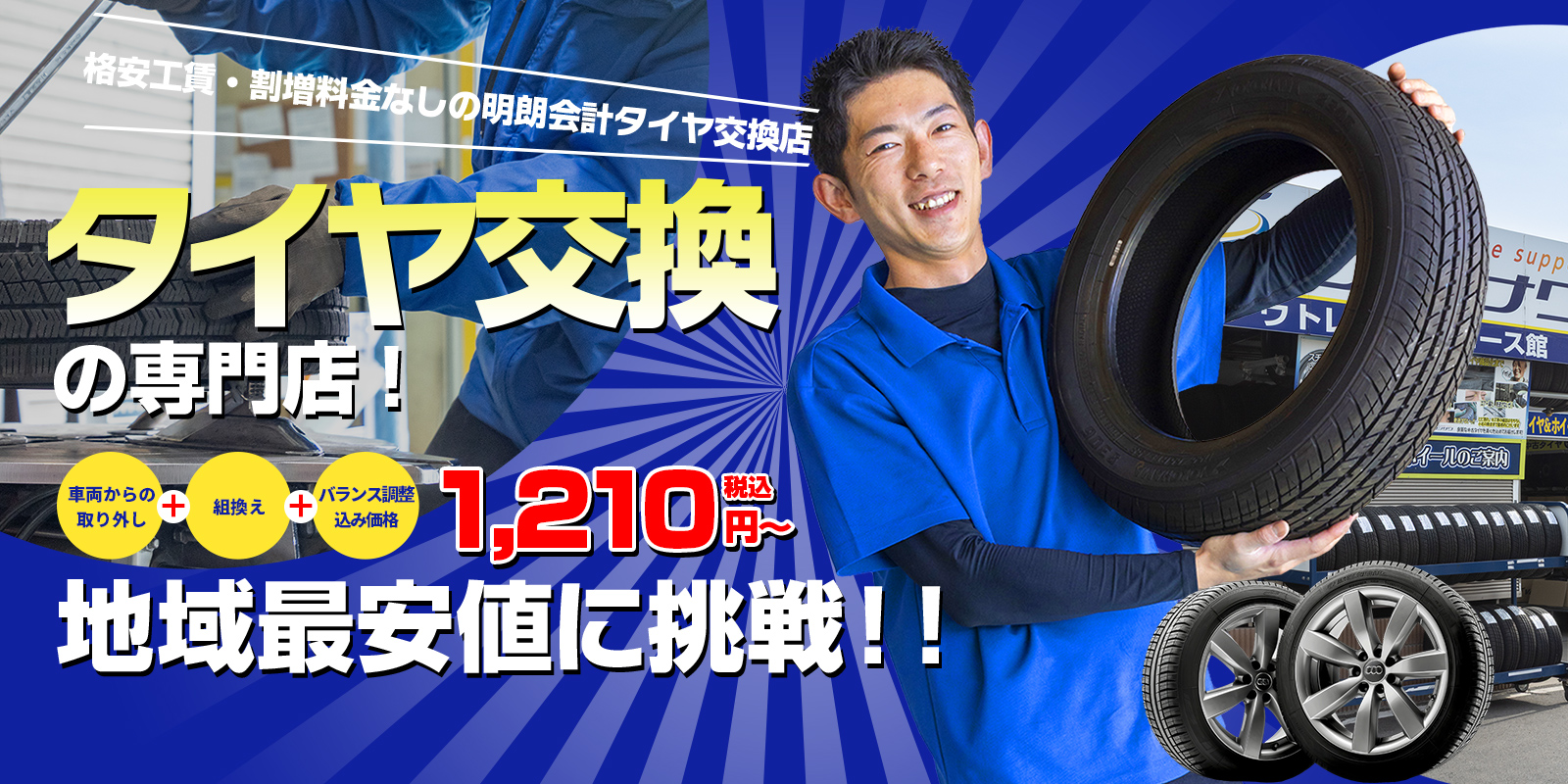 当店はお客様に喜ばれるショップを目指す、格安工賃、割増料金なし、明朗会計のタイヤ交換店です!