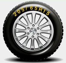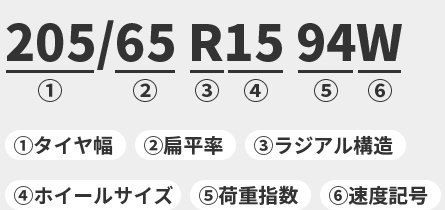 図のタイヤの場合、「205/65R15」になり、インチ数は「15インチ」となります。