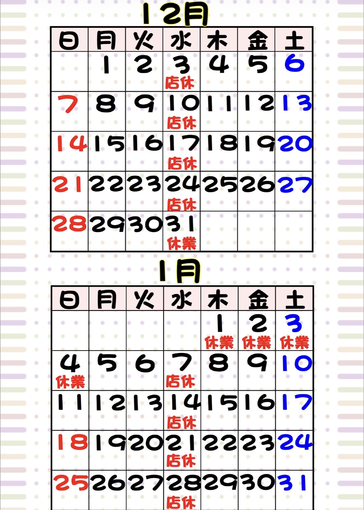 12月・1月の営業日のお知らせです😁❕