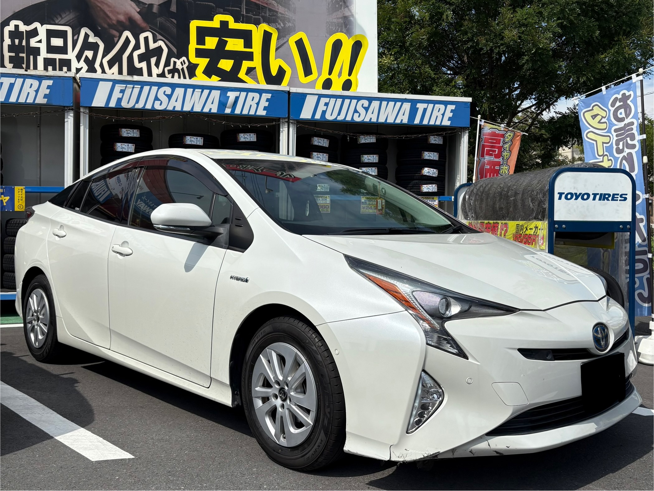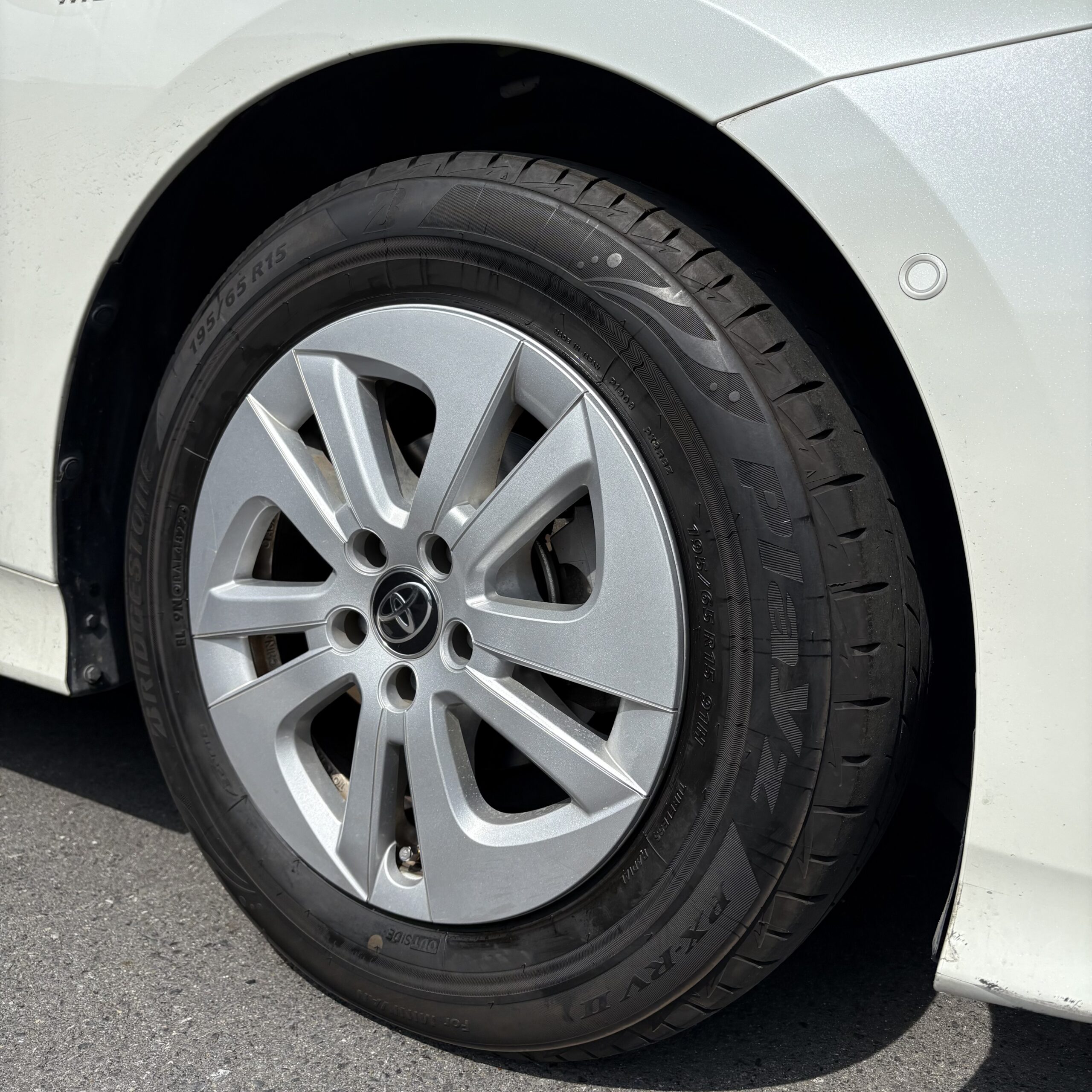 トヨタ プリウスのお客様。直前まで、国産の中古タイヤか海外製の新品で悩まれていましたが、中古タイヤの状態を一目見るなり即決。中古タイヤの詳細は下の「作業内容」に記載しております。